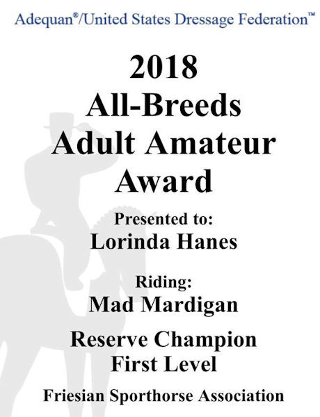 Contratulations to Lori Hanes and Mardi: This pair was Reserve Champion in the USDF All Breeds Awards at First Level Adult Amateur for 2018! |