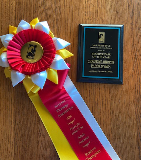 Christie Coppess Murphy and Paddy O Shea Debuted their First level freestyle and won both freestyle classes with a 70% and 69.5% thus securing the Freestyle Championship. They also won First level test 2 and were 4th in the 2018 Az. State First Level Championships. |