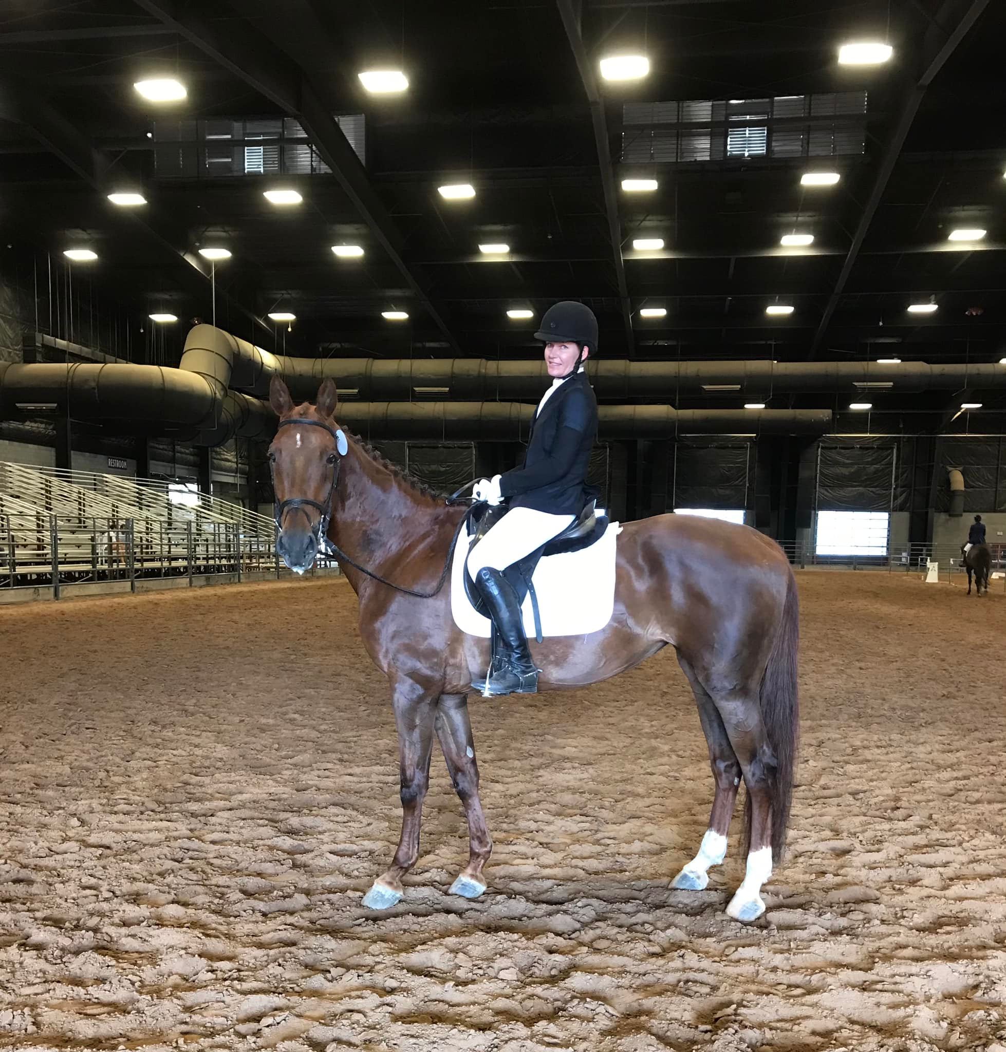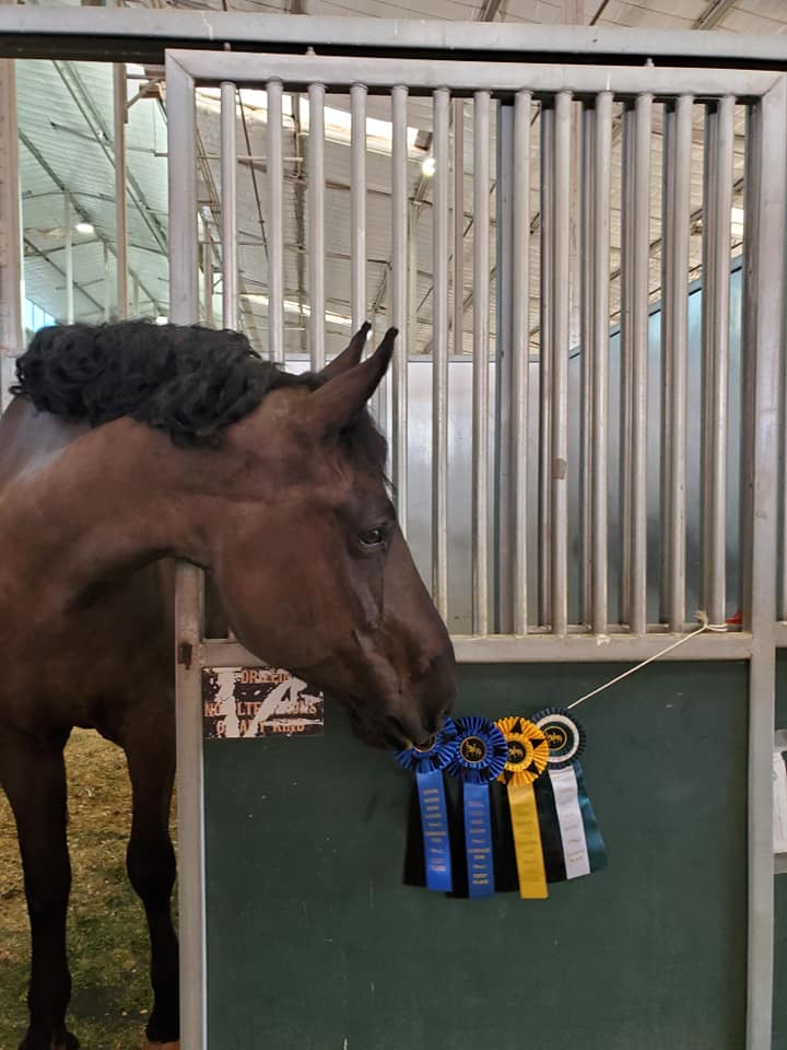 Mary Lipton's big black horse, Logan, won two of his Second level test 3 classes with scores in the 60's and enjoyed stabling overnight. |